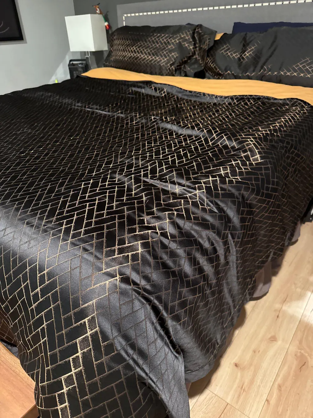 Elevate your bedroom with the Jasmine Black Luxury Jacquard Duvet Cover Set, exclusively available at Roomie Design. The top side is crafted from a premium cotton and satin blend with an anti-wrinkle treatment, offering a smooth, refined finish with a subtle sheen. The underside—everything that touches your skin—is made from 100% long-staple cotton with a 600-thread count, ensuring breathability, softness, and long-lasting comfort.