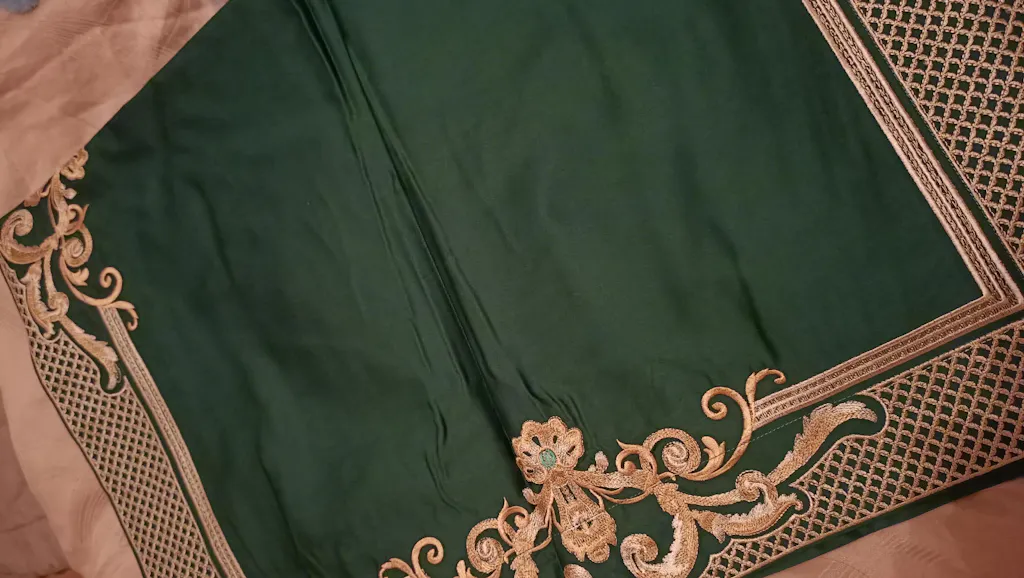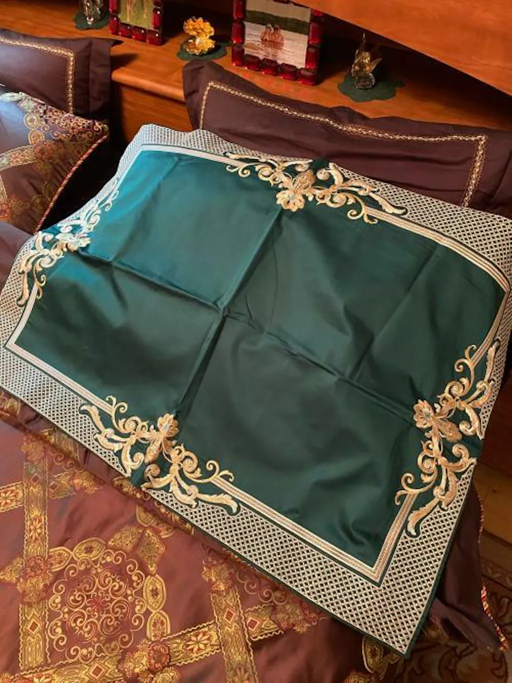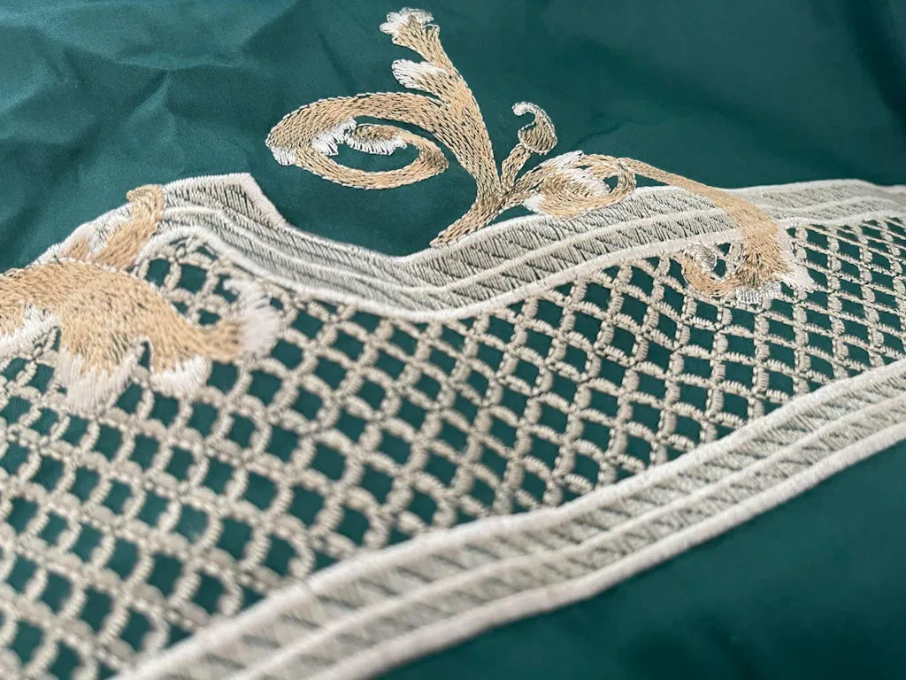 Transform your bedroom into a sumptuous retreat Emerald Green Golden Jacquard Duvet Cover Set. Meticulously crafted from 100% Egyptian cotton, this bedding ensemble seamlessly merges comfort with opulent luxury. The rich emerald green backdrop, paired with intricate golden jacquard detailing and hand embroidery, adds a touch of regal elegance to your space. Immerse yourself in the timeless beauty and unparalleled comfort of this luxurious bedding set.