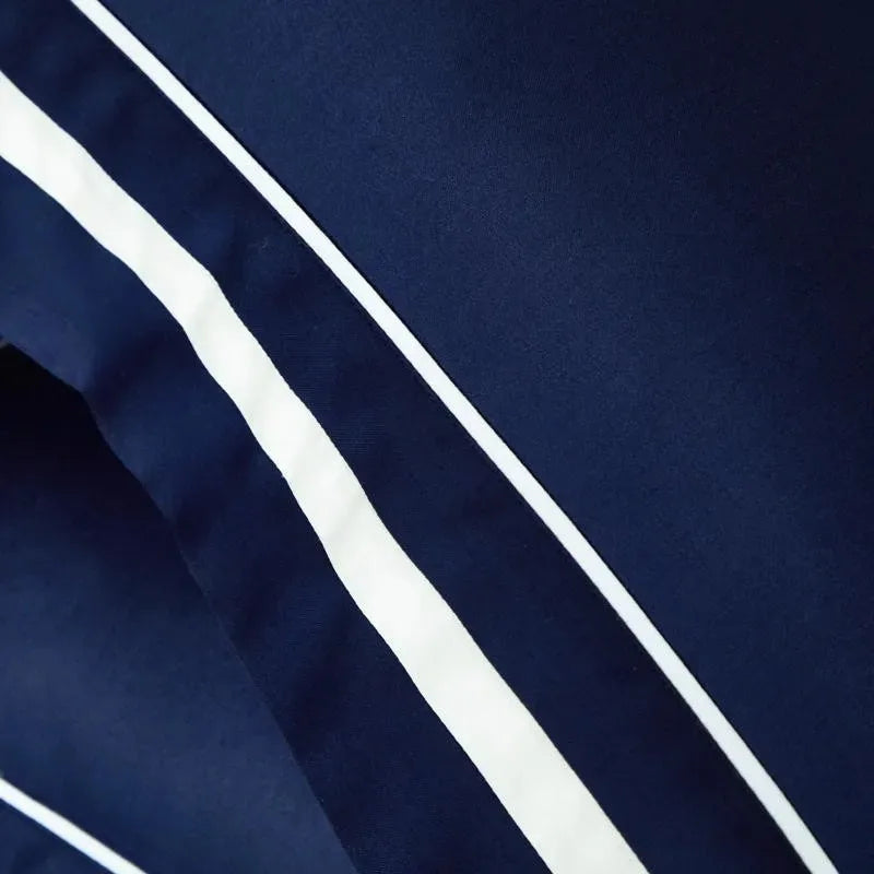 Indulge in the refined elegance of our Marlene Navy Blue 1000 TC Duvet Cover Set, where sophistication meets comfort in every detail. With a deep navy blue background adorned with a crisp white line, this set exudes timeless charm and understated luxury. The elegant contrasting border adds a touch of refinement, beautifully finished on silky smooth cotton sateen for an indulgent feel.