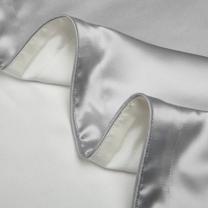Experience the benefits of our smooth silk pillowcases, designed to prevent hair breakage and minimize the appearance of fine lines and wrinkles. The Tencel underside enhances breathability and moisture-wicking, ensuring a cool and comfortable night's sleep. These pillowcases also boast an elegant border, adding a touch of sophistication to your bedding.