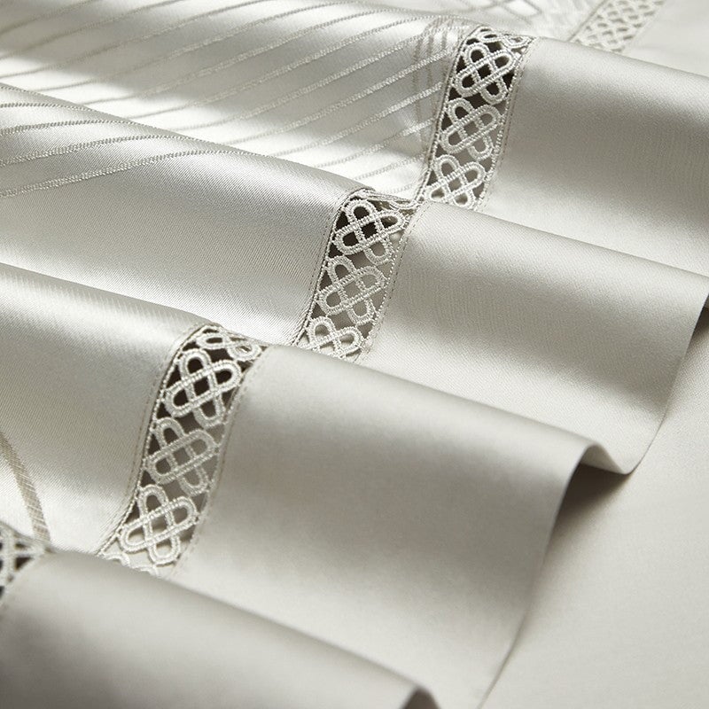The duvet cover's top side is crafted from luxurious satin, while the bottom side boasts 1000-thread-count cotton fabric. The sheet is composed of pure cotton, while the pillowcases feature a top layer of satin for added elegance.