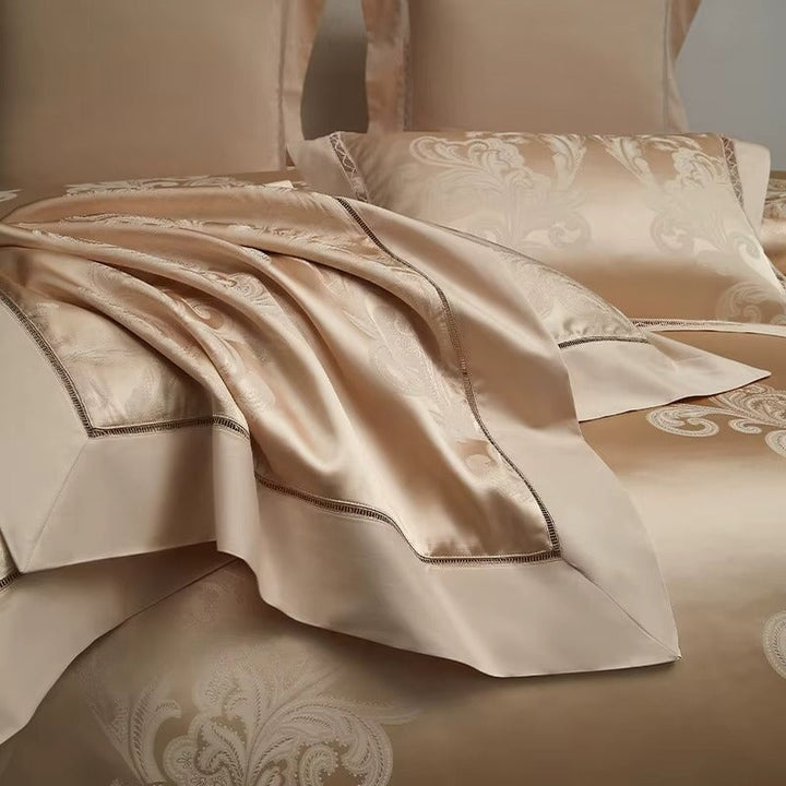 Bring warmth and refined elegance to your bedroom with the Soleil Luxury Duvet Cover Set. Showcasing a soft golden hue and intricate floral patterns, this set evokes timeless sophistication with a radiant touch. Crafted from 100% long-staple, silky soft cotton, the duvet cover is luxuriously smooth and breathable, offering exceptional comfort night after night. Ideal for those who appreciate regal design and everyday luxury, the Soleil Duvet Cover Set transforms your space into a serene and graceful sanctuary.