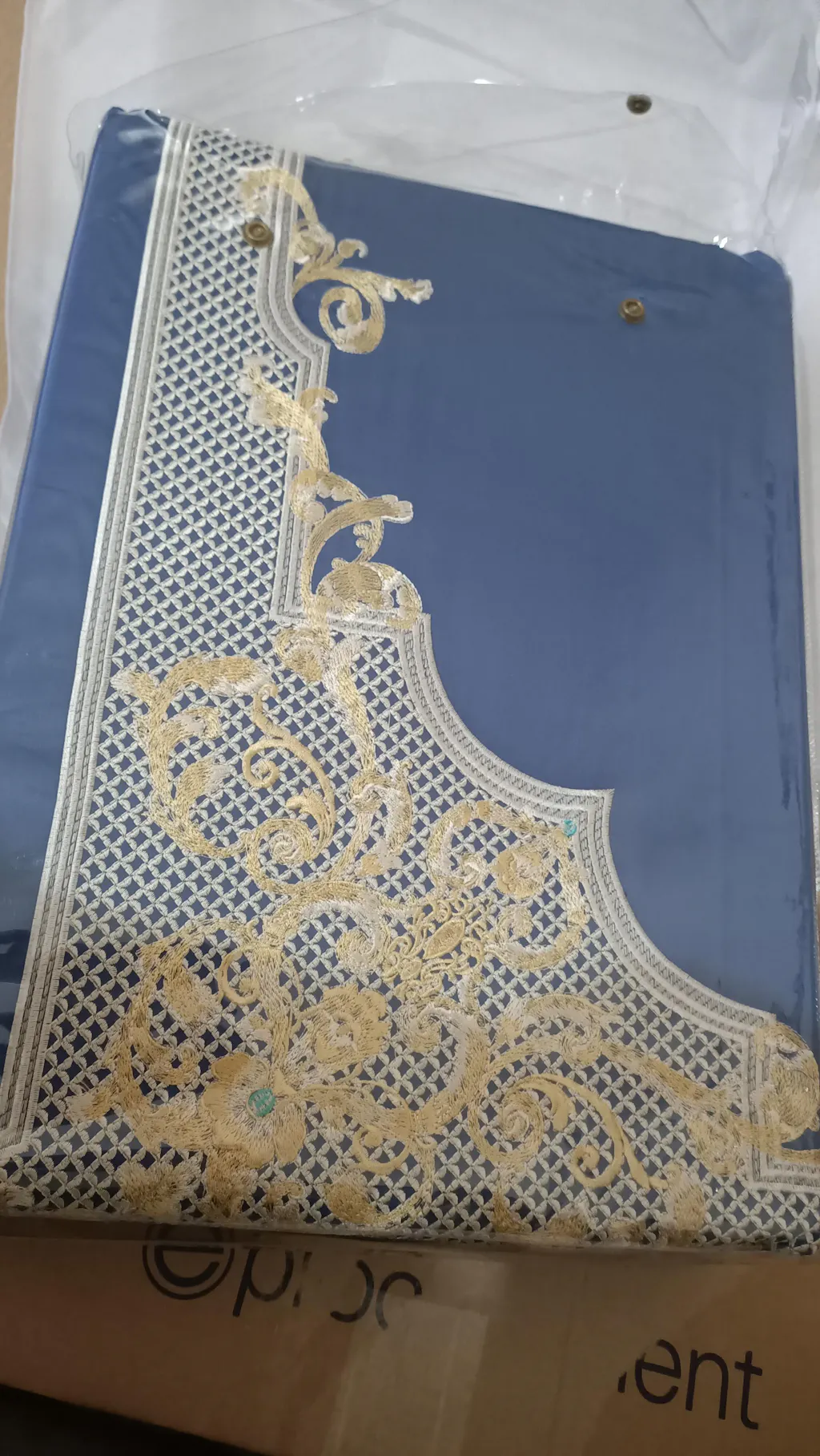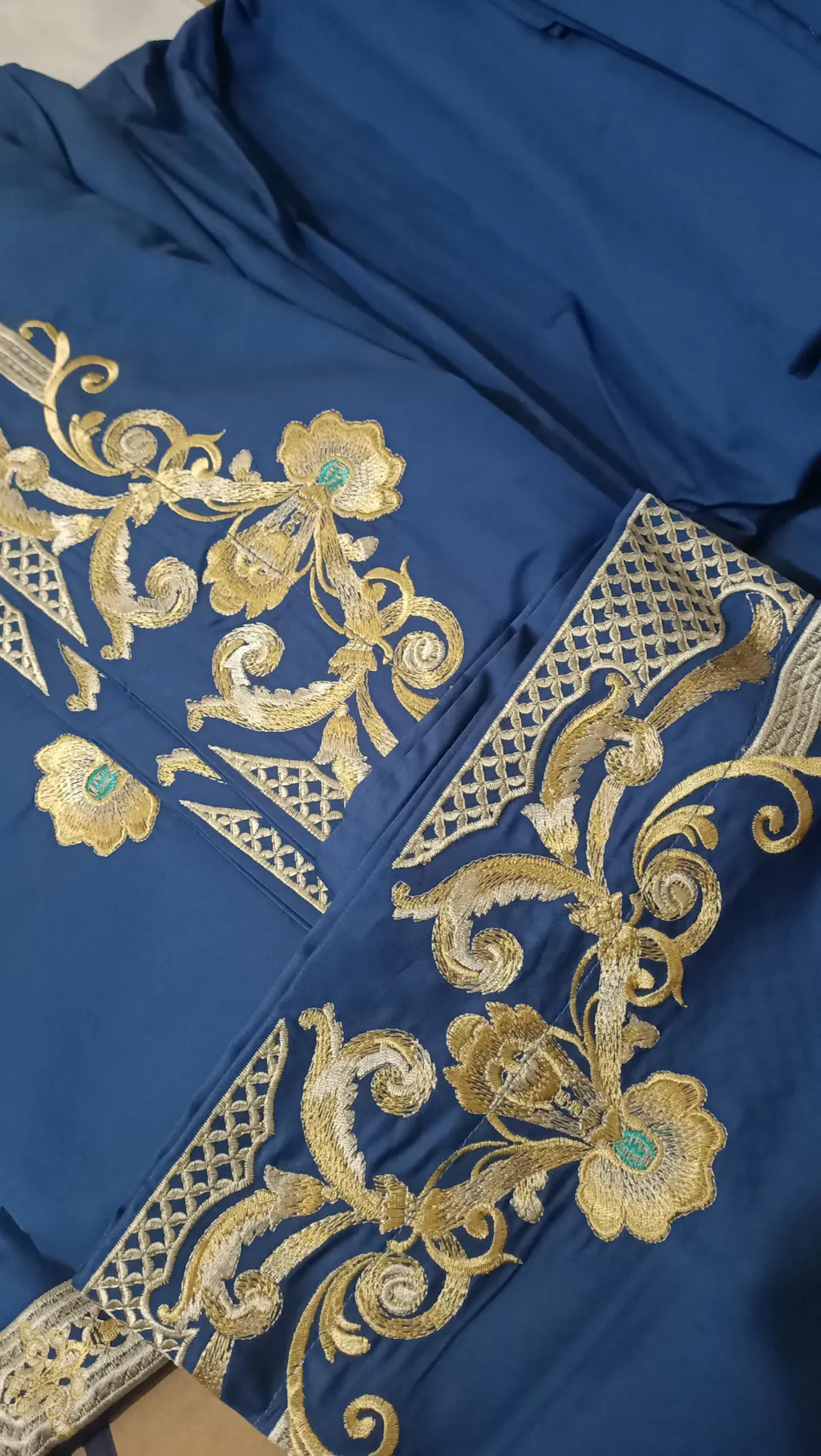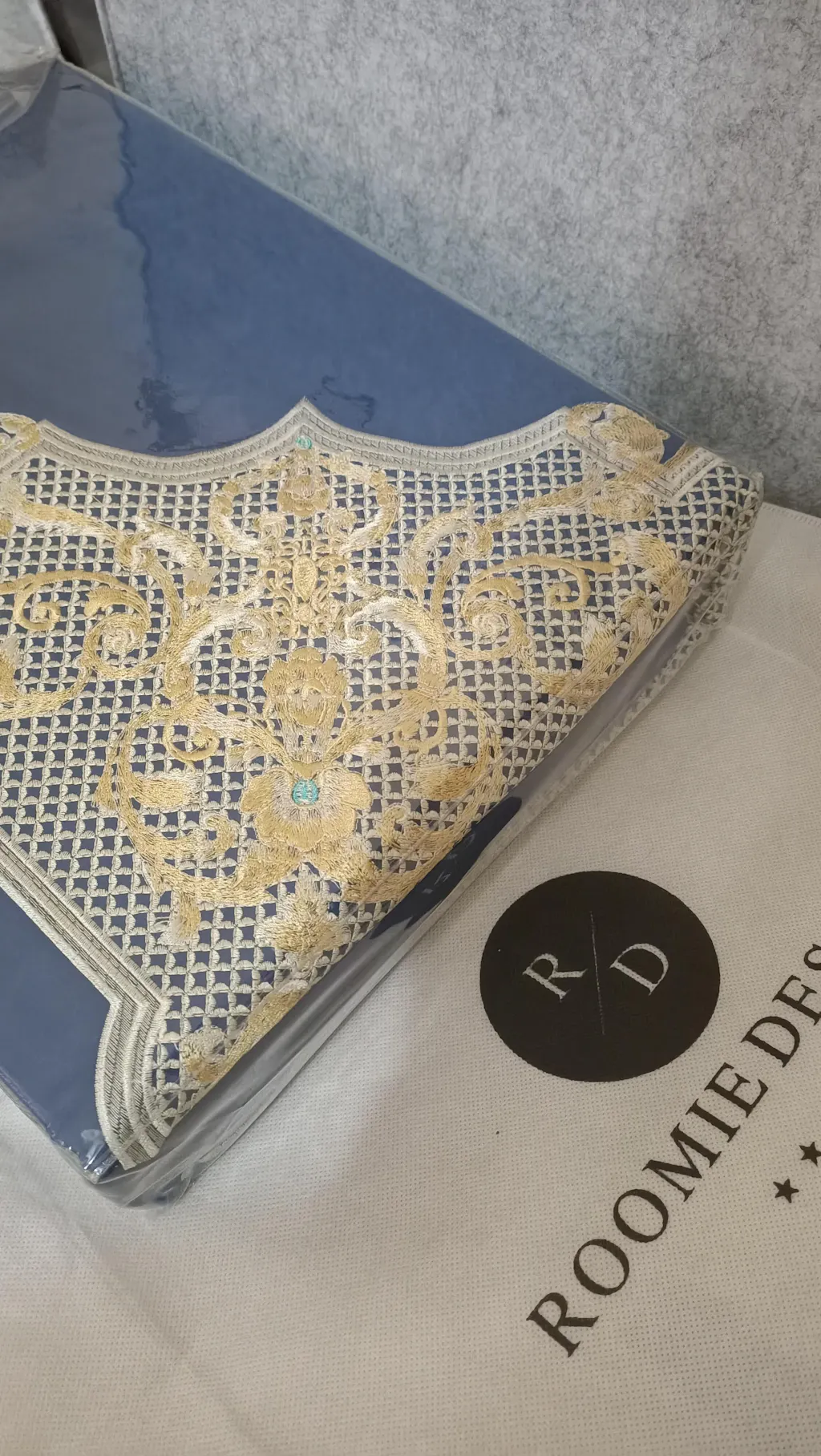 Transform your bedroom into a regal retreat with our Midnight Blue Golden Jacquard Duvet Cover Set. Meticulously crafted from 100% Egyptian cotton, this bedding ensemble seamlessly merges comfort with unparalleled luxury. The timeless and classic blue shade exudes a sense of regality, perfectly complemented by the intricate golden jacquard detailing and hand embroidery, creating an opulent focal point in your space.